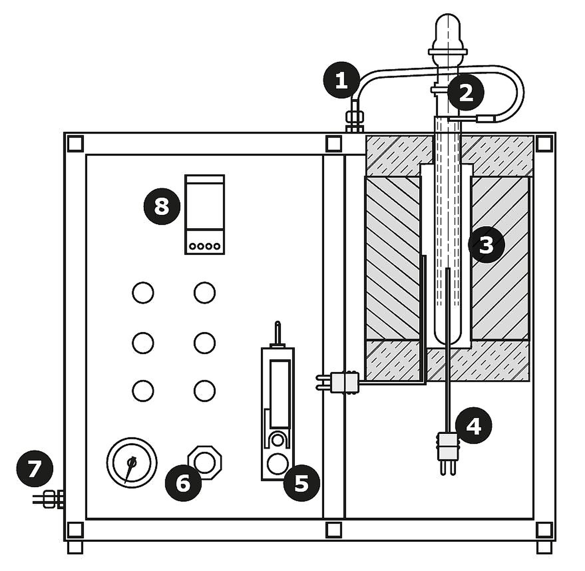 CRF / 1是单区管式炉,具有良好的垂直温度分布,可加热到1000°C。保持温度的精度为±1°C。该炉有一个带两个石英管的管式反应器和一个带毛玻璃接头的盖子。带有进气口的外管允许气体向下流到管的底部并在向上流过焦炭床之前被预热。内部反应管安装在外管内部,内部反应管装有多孔盘,因此焦炭床的底部位于炉子的中间。